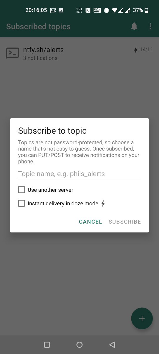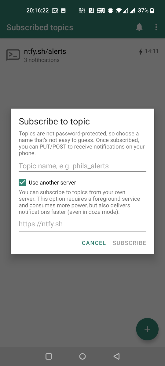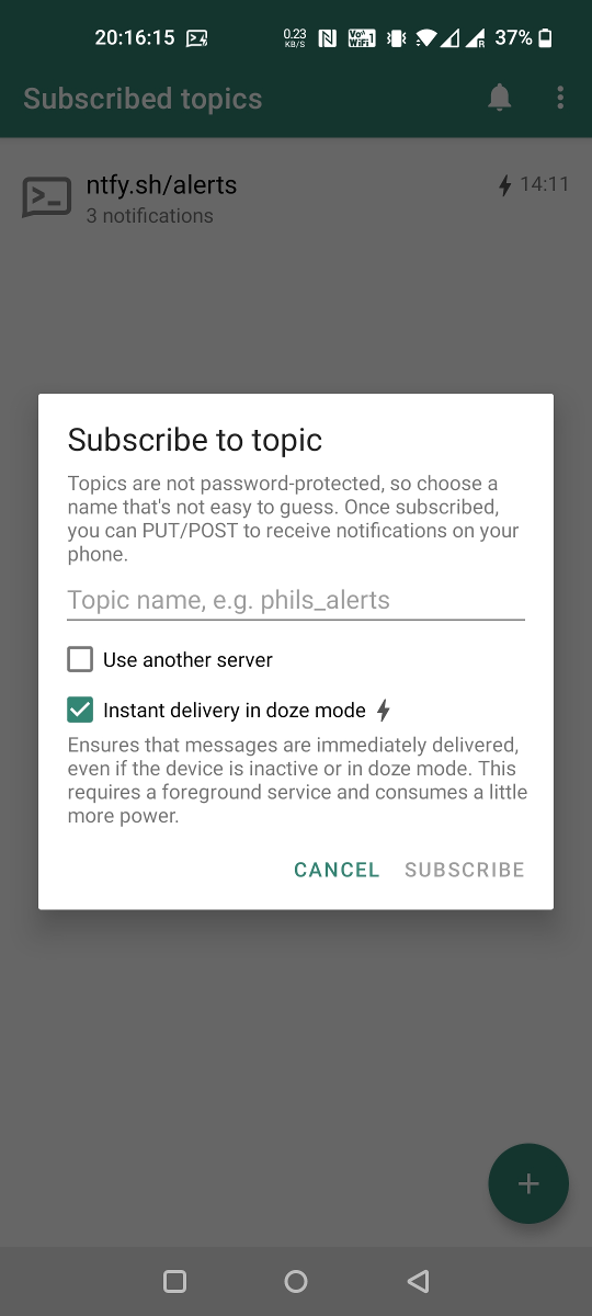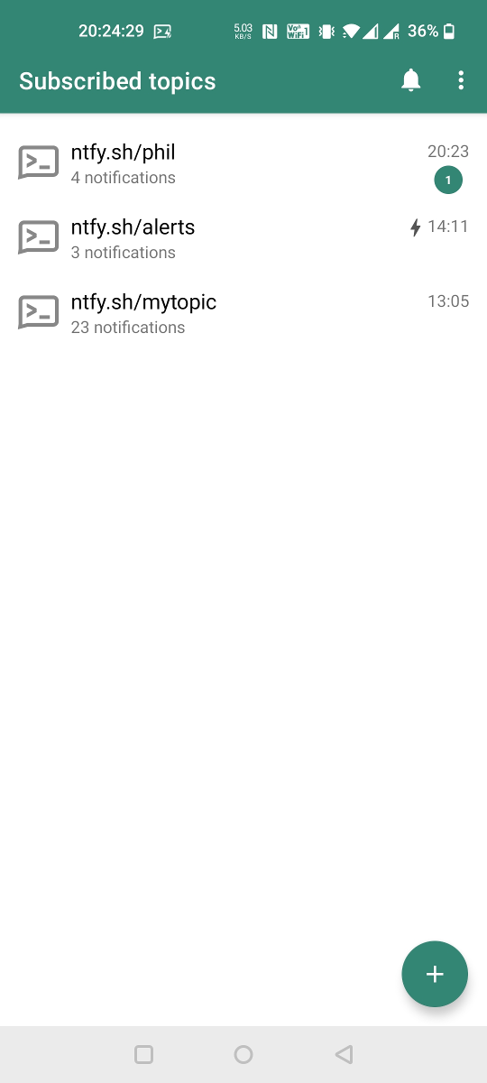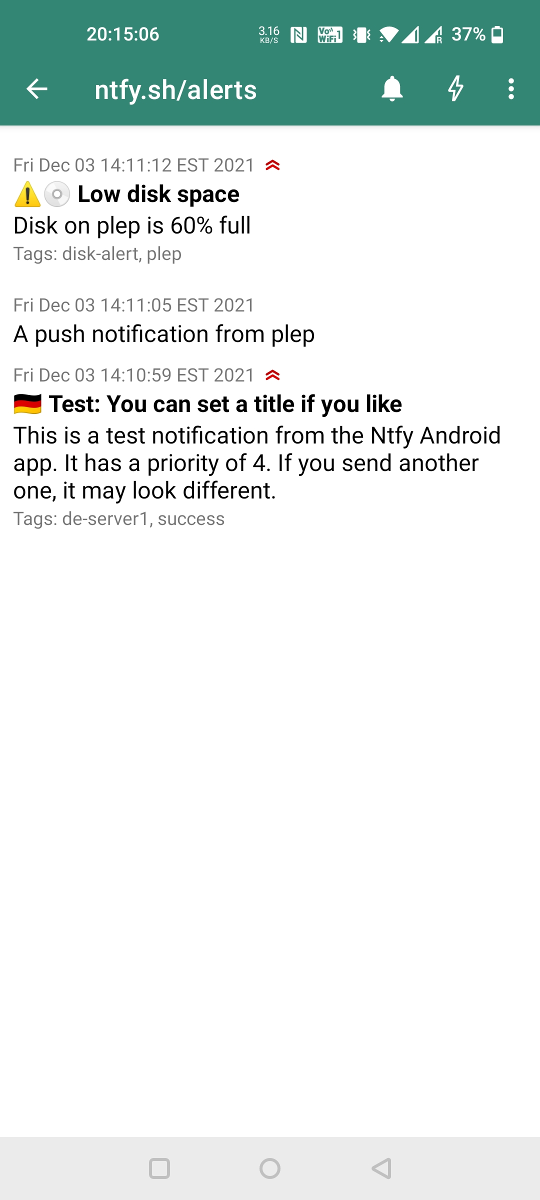 You can use the ntfy Android App to receive notifications directly on your phone. Just like the server, this app is also open source. Since I don't have an iPhone or a Mac, I didn't make an iOS app yet. I'd be awesome if someone else could help out.