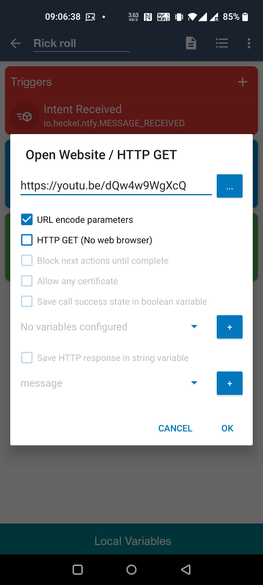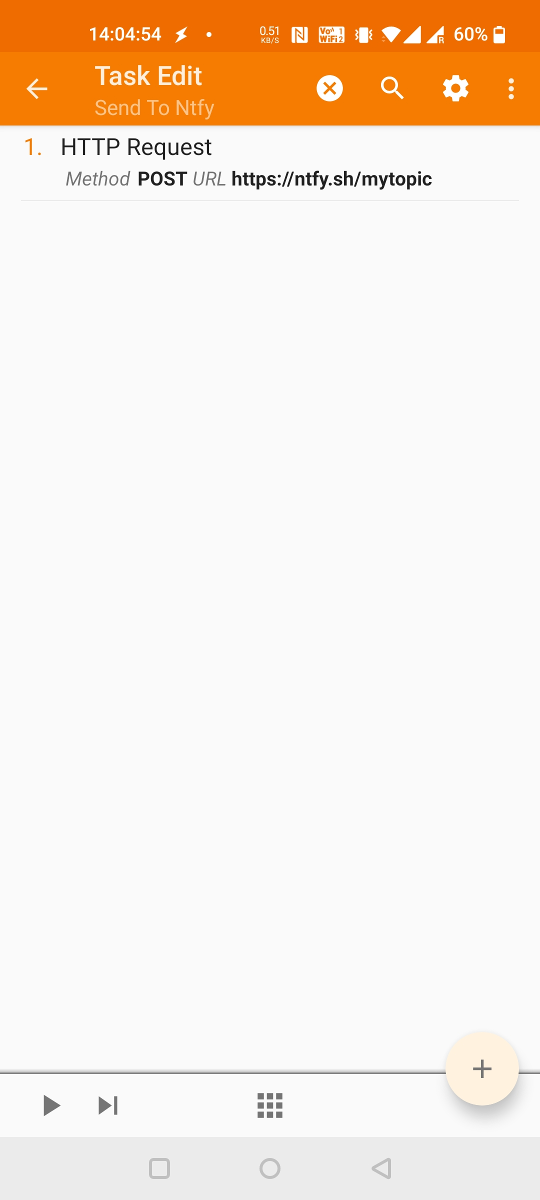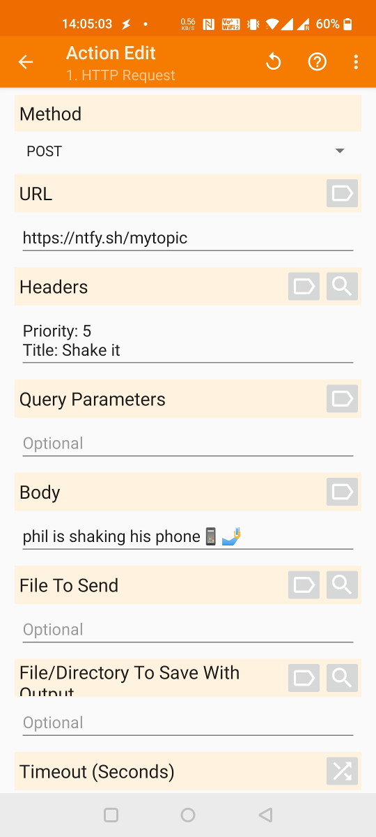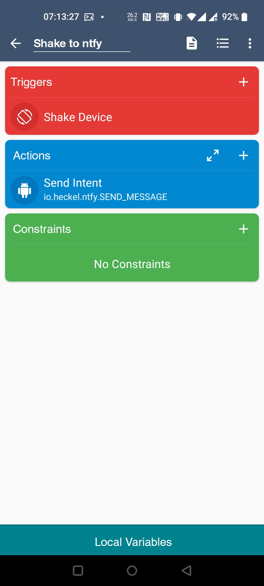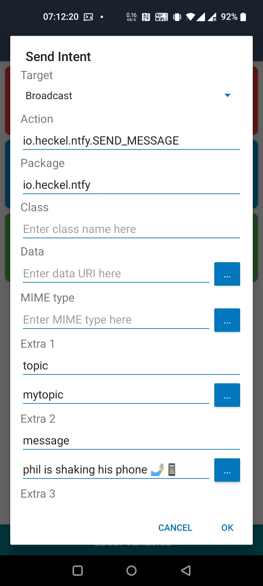 To send messages from other apps (such as MacroDroid and Tasker), you can broadcast an intent with the io.heckel.ntfy.SEND_MESSAGE action. The ntfy Android app will forward the intent as a HTTP POST request to publish a message. This is primarily useful for apps that do not support HTTP POST/PUT (like MacroDroid). In Tasker, you can simply use the "HTTP Request" action, which is a little easier and also works if ntfy is not installed.