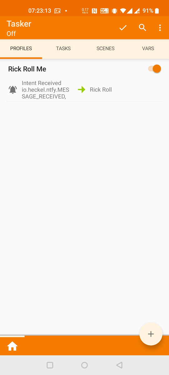 To react on incoming notifications, you have to register to intents with the io.heckel.ntfy.MESSAGE_RECEIVED action (see code for details). Here's an example using MacroDroid and Tasker, but any app that can catch broadcasts is supported: