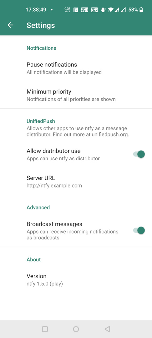To use ntfy as a distributor, simply select it in one of the supported apps. That's it. It's a one-step installation 😀. If desired, you can select your own selfhosted ntfy server to handle messages. Here's an example with FluffyChat: